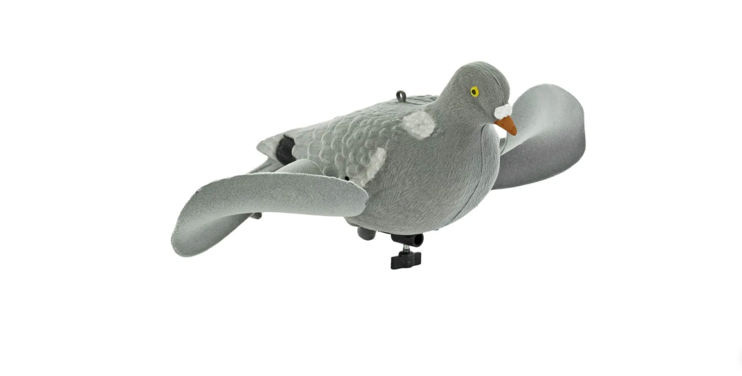 Denne flokkede, flagrende duelokkemad er perfekt til at indrette et sikkert område til duer. Den ser realistisk ud og er flokket. Det giver en fløjlsagtig tekstur på duens overflade, som får den til at se meget naturlig ud. Denne flagrende duelokkemad med floket overflade har to vinger, der kan dreje om deres egen akse. De er formet, så allerede en smule vind sætter dem i bevægelse, så det ser ud, som om de flyver.