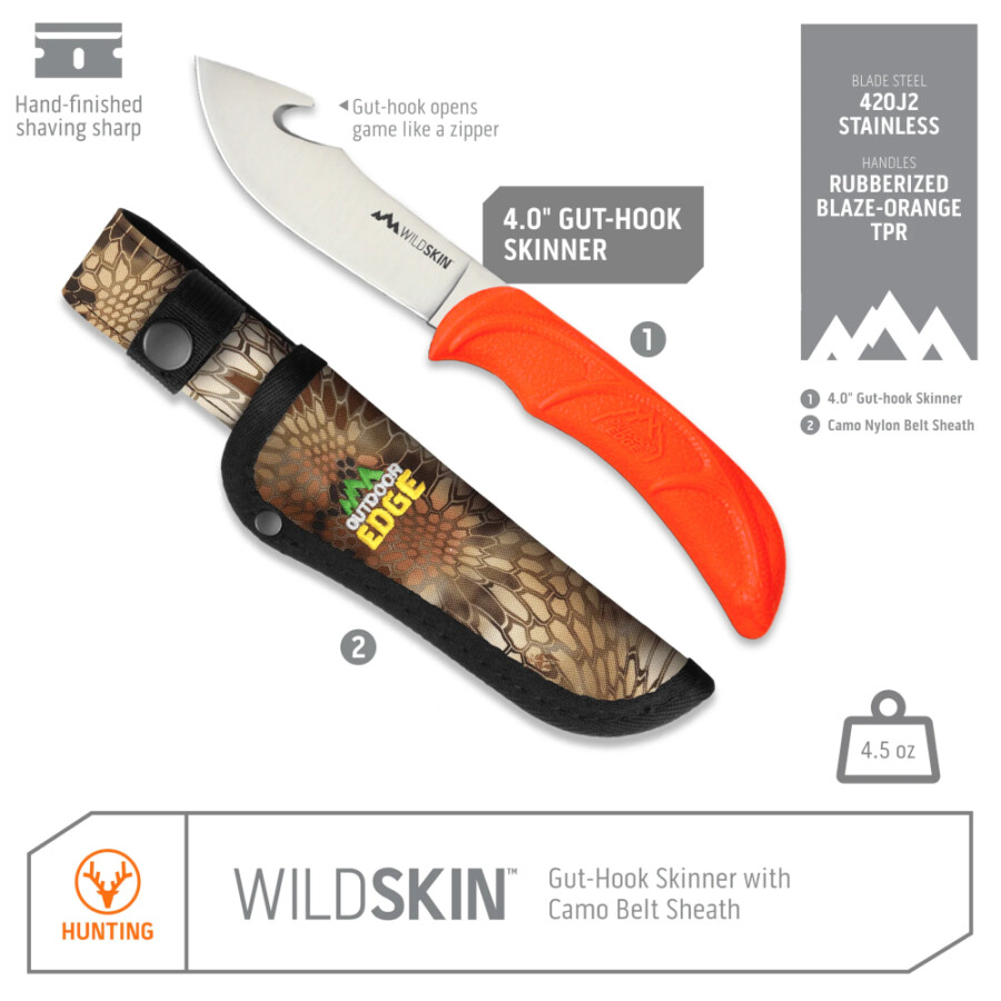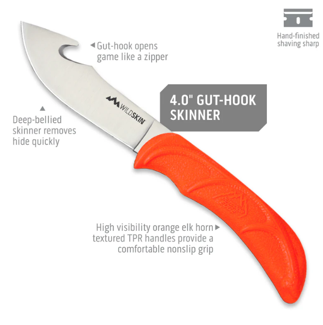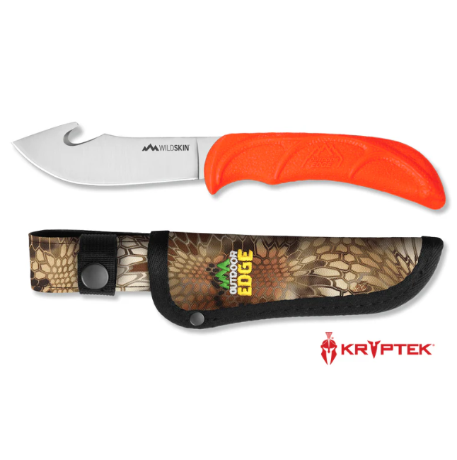 Robust fastmonteret jagtkniv til udtagning af vildt. Det 4,0 tommer store blad i 420J2 rustfrit stål er præcisionsvarmebehandlet og håndlavet, så det er knivskarpt. For hurtig og nem brug har kniven en udtagningskrog, som forhindrer, at man rammer indvoldene under udtagningen. Det gummierede, orange TPR-håndtag giver stor synlighed i felten og et skridsikkert greb, selv når det er vådt. WildSkin leveres komplet med en bælteskede i Kryptek®-nylon.